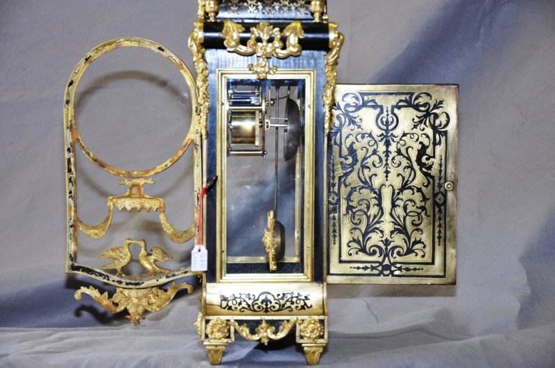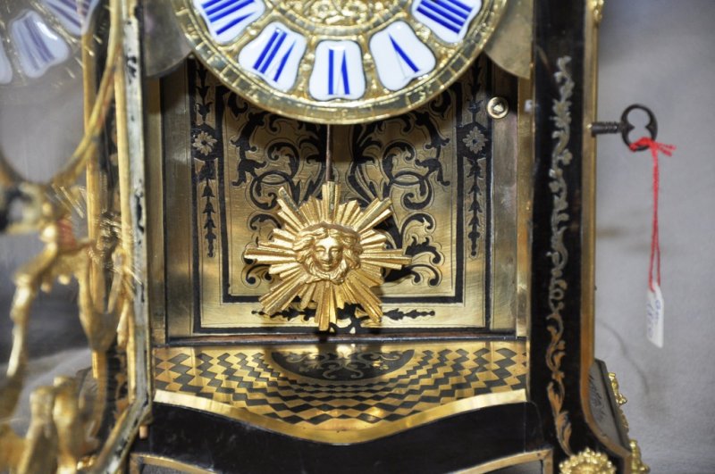 Großes Pendulenwerk mit Brocotgang, Rechenschlagwerk, Halbstundenschlag auf Glocke und schwerem Sonnenpendel mit Federaufhängung. 14 Tage Gangdauer.