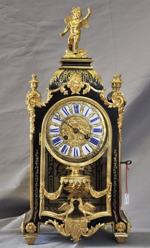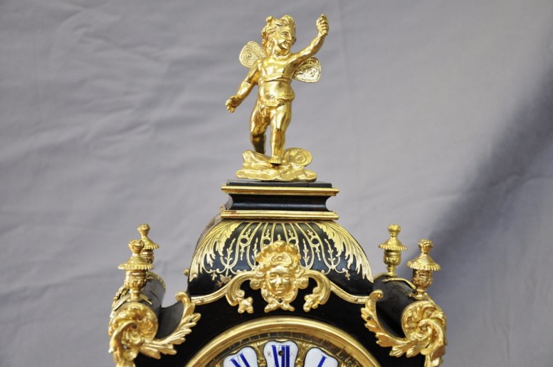 Französische Prunkpendule aus der Zeit Napoleon des III. um 1860. Messingintarsiertes Schildpattgehäuse im Boulle-Stil mit aufwendig gearbeiteten, vergoldeten Bronzeapplikationen.